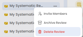 If you do find the need to delete a review, simply go to the left side menu and select the review you want to delete. Next, click on the "..." icon next to the review's title. From the dropdown menu, choose "Delete Review" to permanently delete the systematic review.