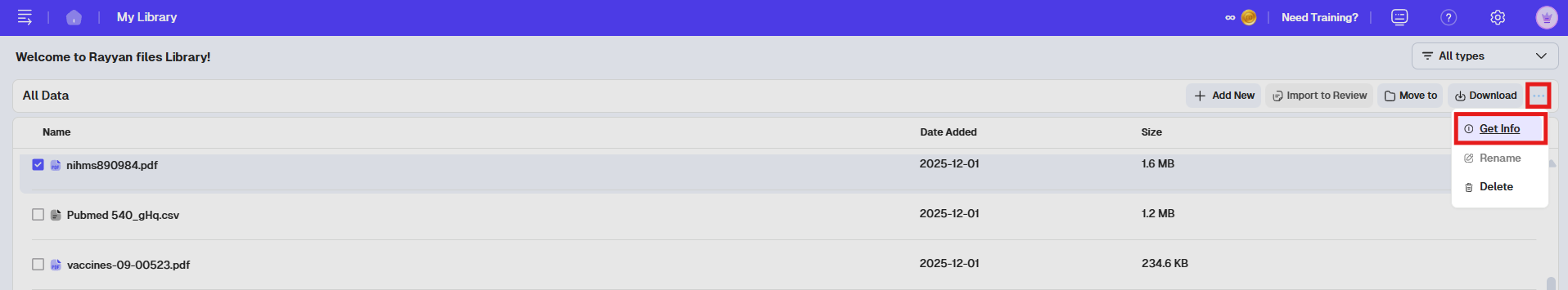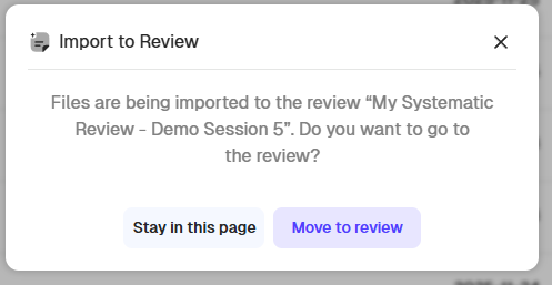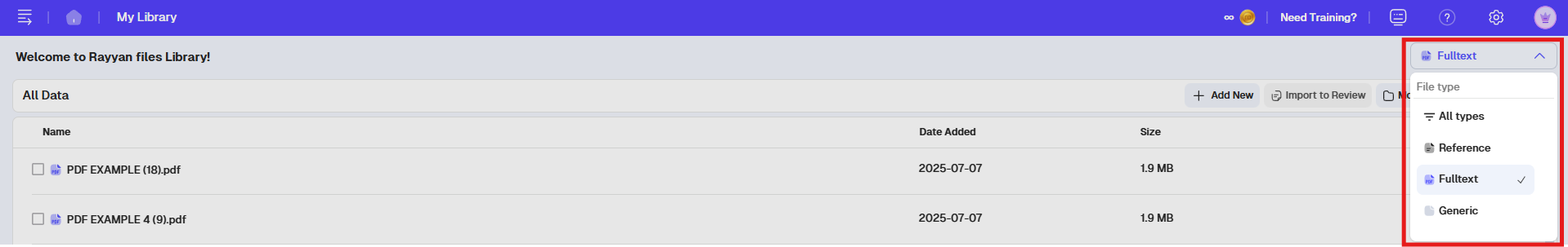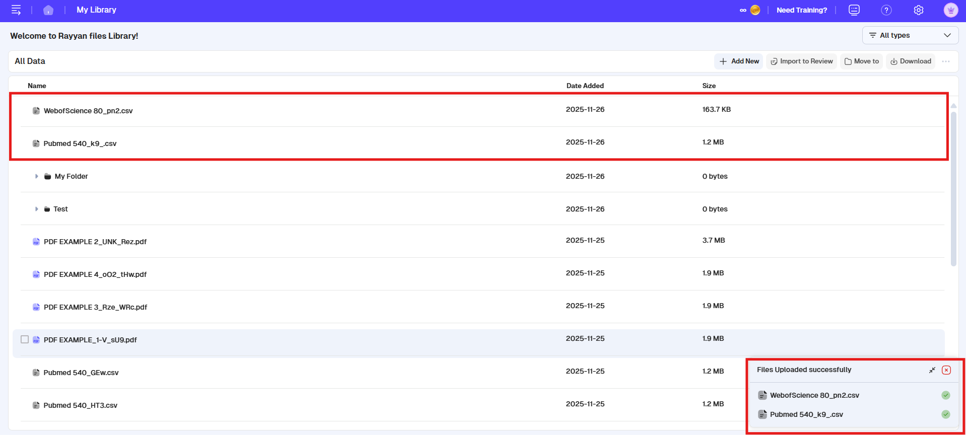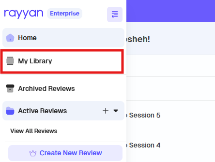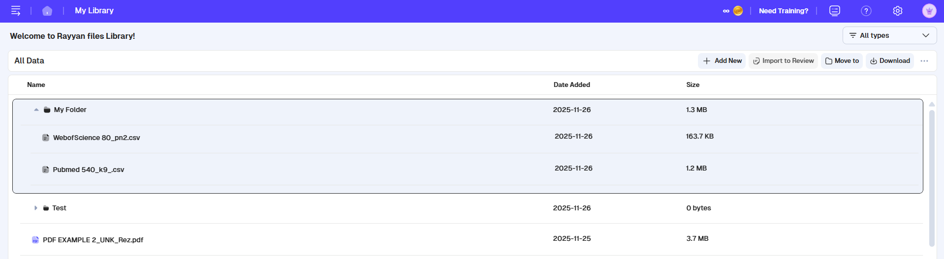 My Library brings cloud-based organization to your entire research collection. Import reference files, full-texts, and other generic file types that relate to your research and organize them into folders. You can then import reference files into your reviews, and have Rayyan auto retrieve full texts using its advanced automatch PDF feature.