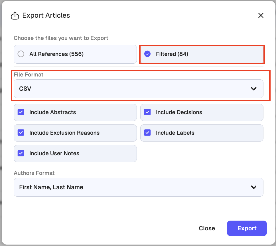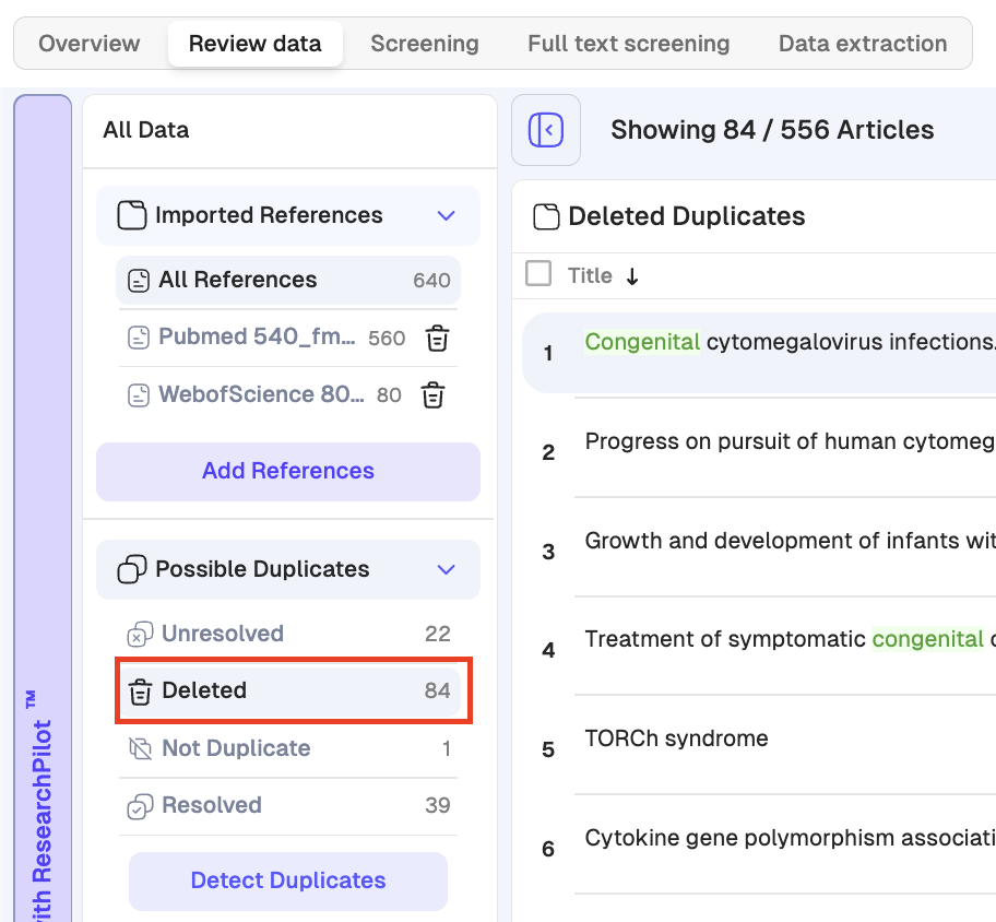 If you need to document which duplicates were removed from your review (for reporting or audit purposes), you can export the list of deleted duplicates at any time.